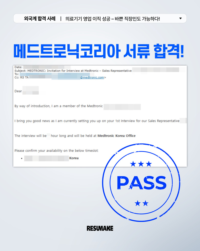 지원자는 외국계 기업 이직을 처음 준비했음에도 불구하고, 효과적인 전략을 통해 메드트로닉 서류 합격을 포함한 여러 외국계 기업 면접 기회를 잡았습니다.