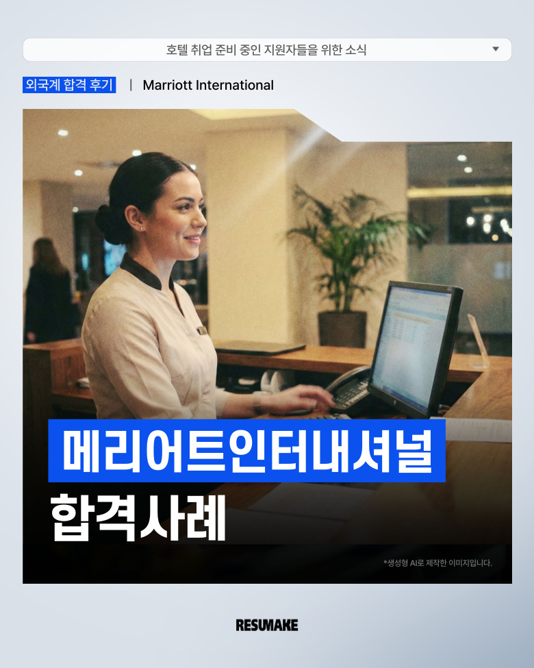 메리어트 1차 면접은 한국어와 영어가 섞여 진행되었고, 지원자는 레쥬메이크와 함께 준비했던 내용 덕분에 전체 흐름을 잘 유지하며 답변할 수 있었습니다.