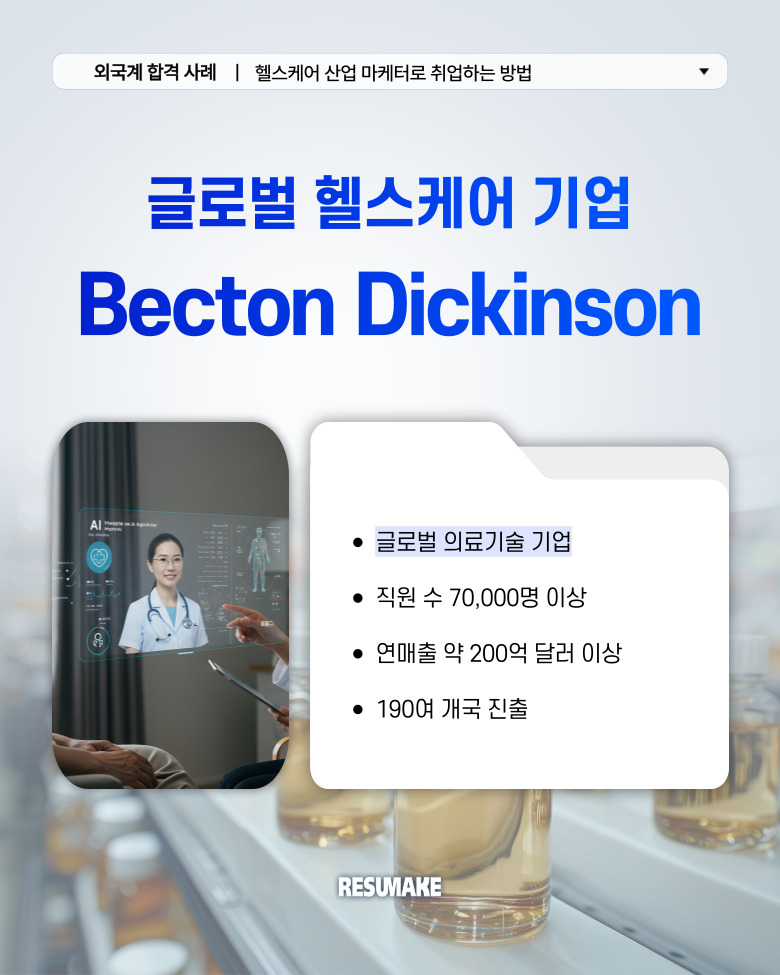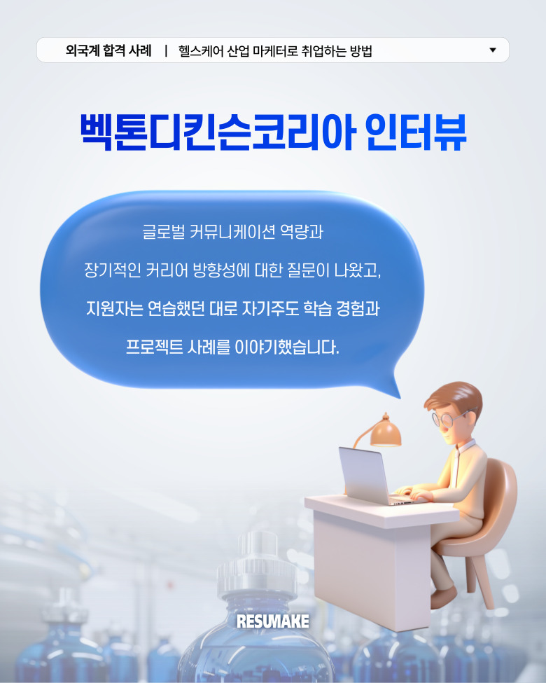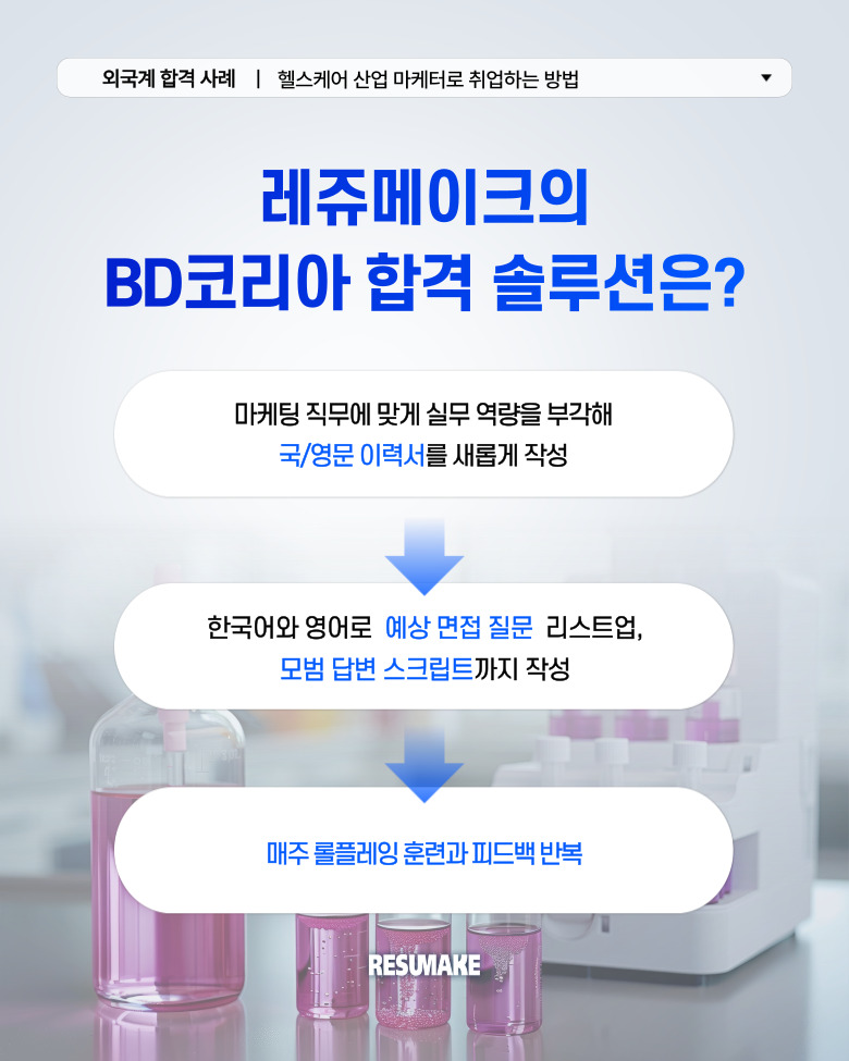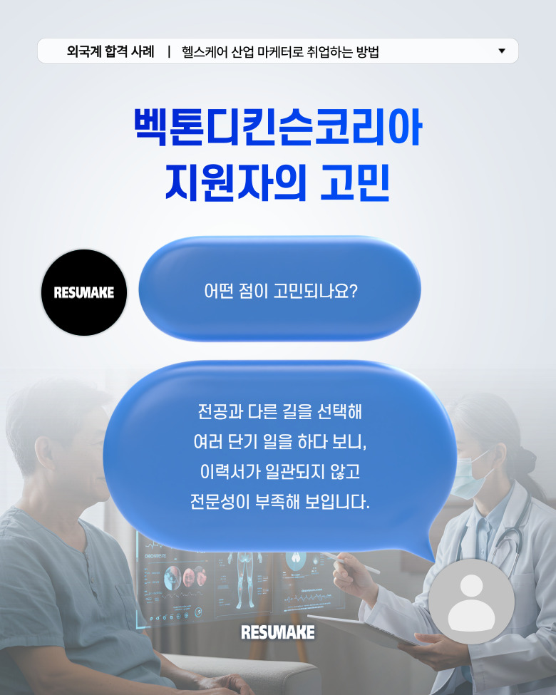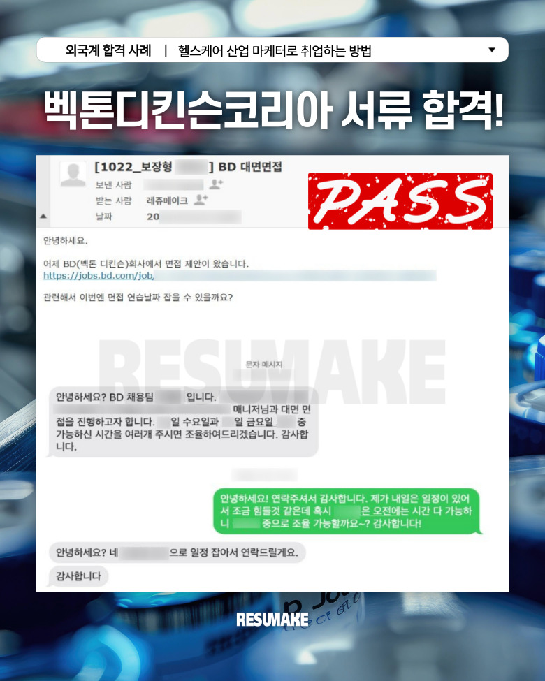 그러다 전문가의 도움을 받기로 결심하고 컨설팅을 통해 이력서와 면접을 새롭게 준비한 결과, 글로벌 헬스케어 기업 벡톤디킨슨에 마케팅 직무로 면접을 보게 되었는데요.