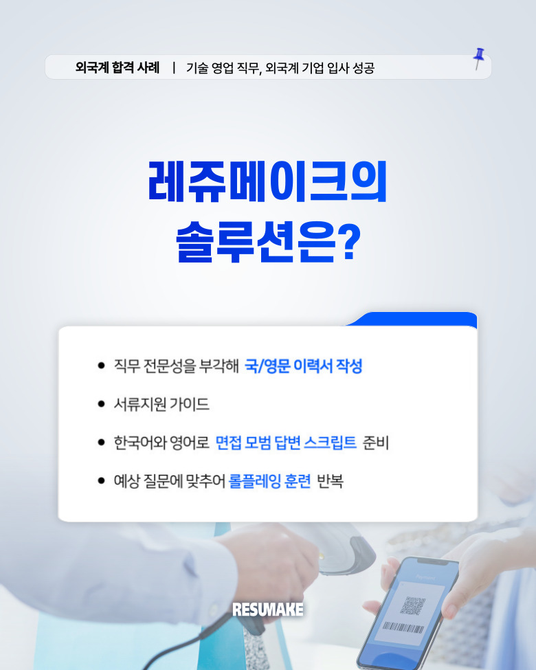 “이전에는 외국계 기업 취업이 어렵다고 느꼈지만, 레쥬메이크의 컨설팅을 통해 전략적인 접근법을 익힌 후에는 단기간에 여러 기업에서 서류 합격 및 면접 제안을 받는 성과를 거두게 되어 만족스럽다.”라는 합격 후기도 전해주었습니다.
