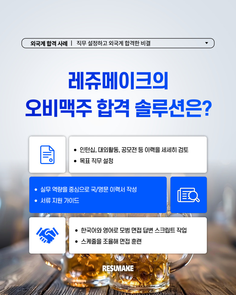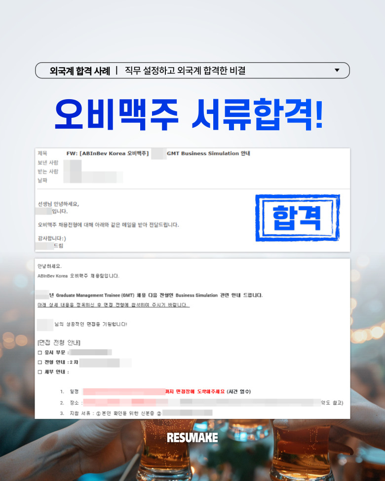 하지만 이러한 상황 속에서 레쥬메이크 컨설팅을 통해 직무를 명확하게 설정하고 서류와 면접을 맡긴 결과, 에이비인베브 GMT 프로그램의 서류 전형 등 여러 외국계 기업에 합격하였는데요.