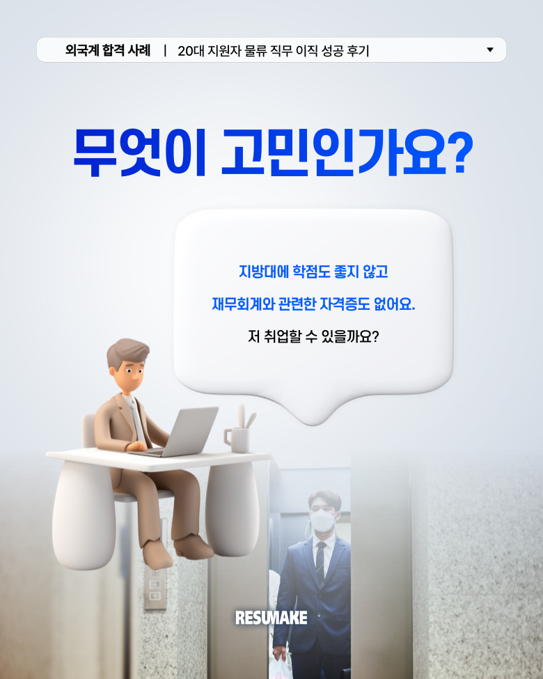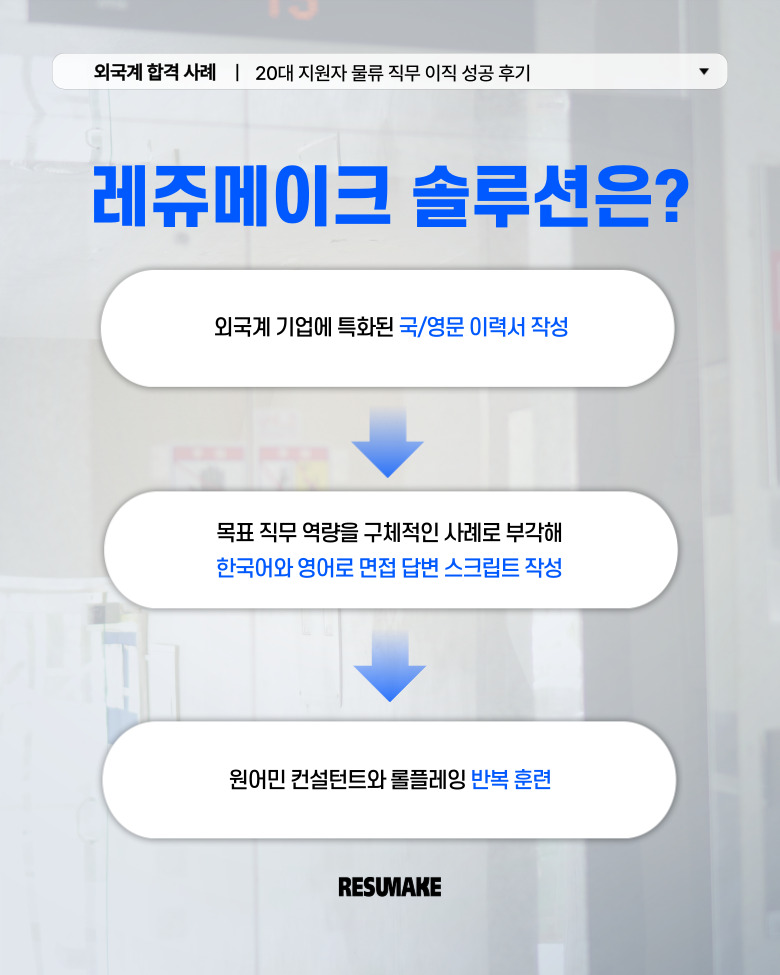 지원자는 자격증도 없고, 어학 점수도 없는 상황에서 중소기업만 바라보던 상황이었지만, 레쥬메이크와 함께 전략적으로 준비한 국/영문 이력서와 면접 대비로 글로벌 기업에서 기회를 잡을 수 있었는데요. 자세한 내용을 본문에서 소개하도록 하겠습니다.