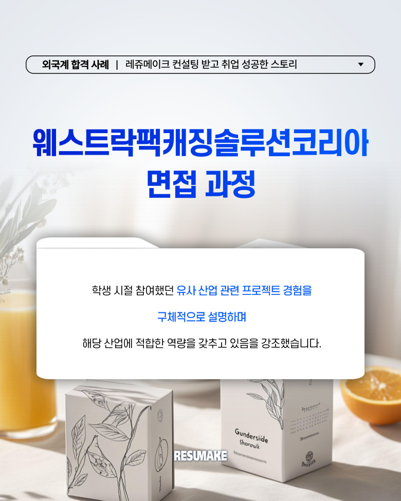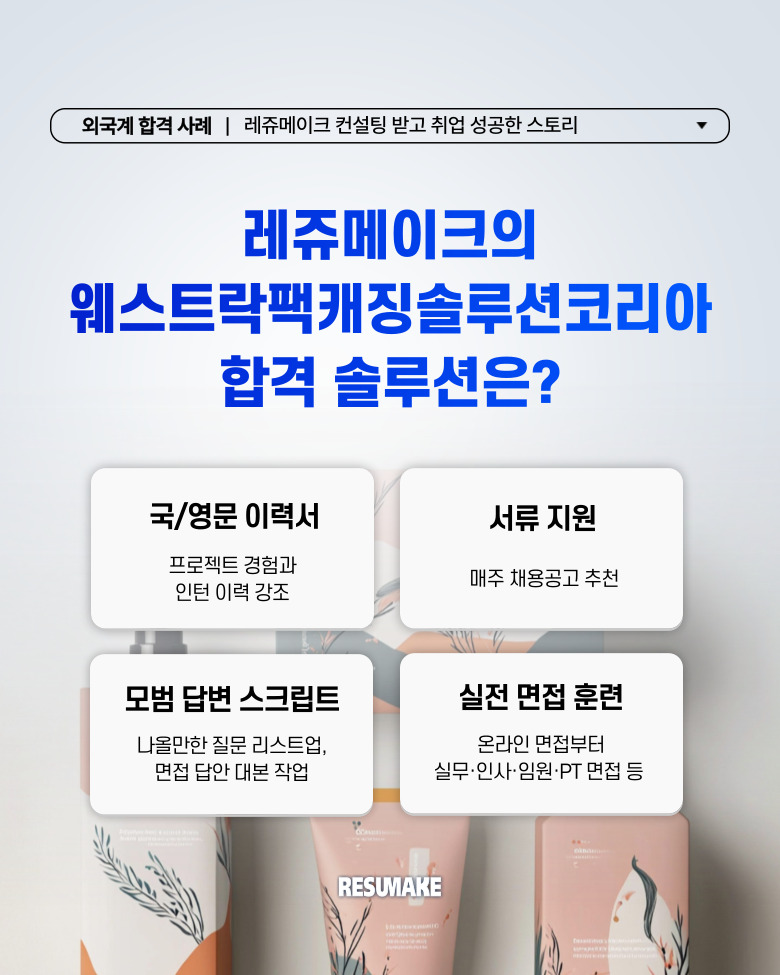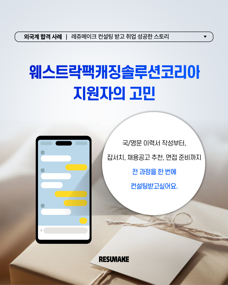 하지만 레쥬메이크 컨설팅을 받기 시작한 뒤, 웨스트락팩캐징솔루션코리아 인턴십 포지션 등 여러 곳에 면접 제안을 받아 입사하였는데요.