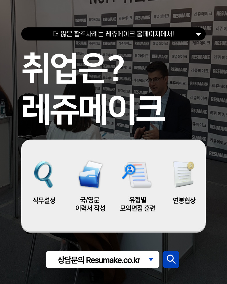 “레쥬메이크의 전략적 지원과 컨설팅이 없었다면 이 정도로 빠르게 여러 합격을 받을 수는 없었을 것”이라며 처음부터 방향을 명확히 설정하고 집중한 것이 무엇보다 큰 도움이 되었다고 전하기도 하였습니다.