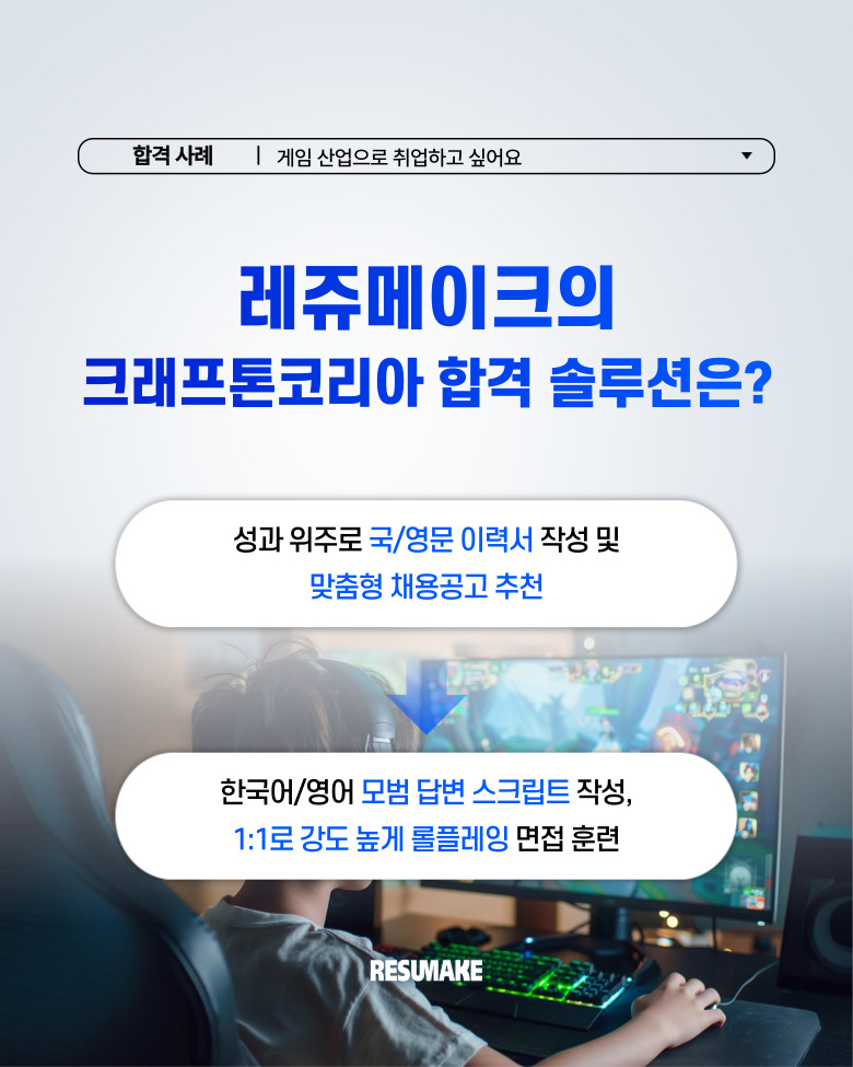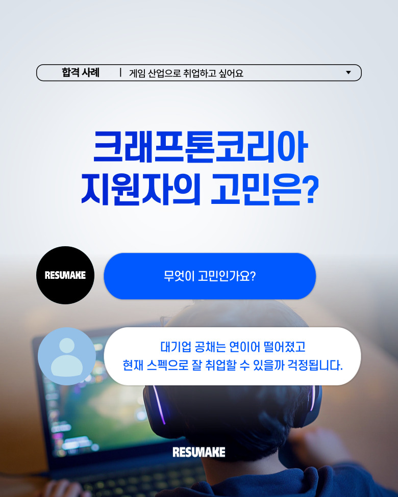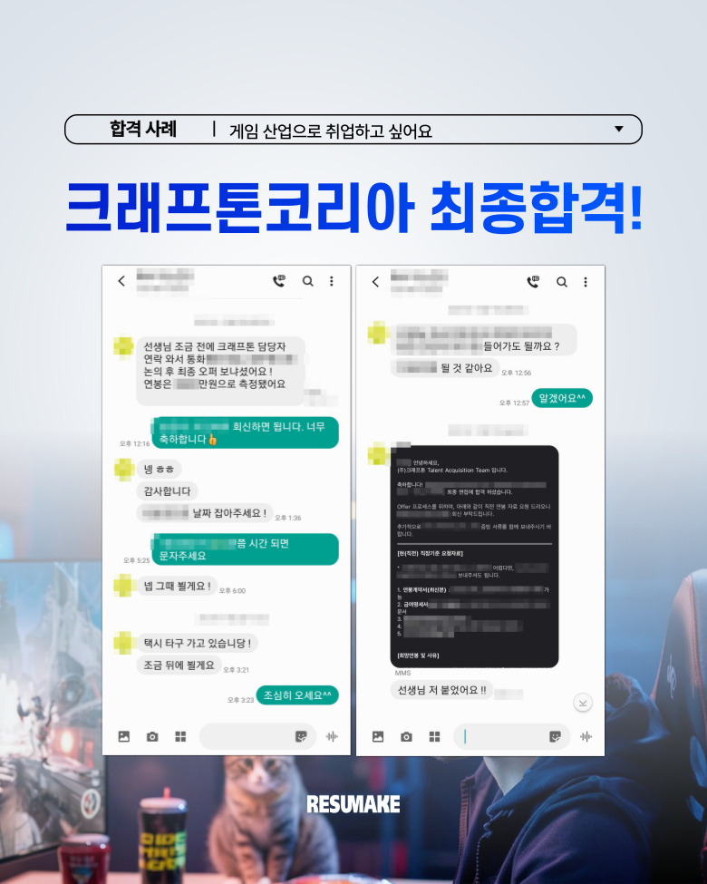 그러다 레쥬메이크 컨설팅을 통해 체계적으로 준비한 끝에, 크래프톤코리아에 최종합격하게 되었는데요.
