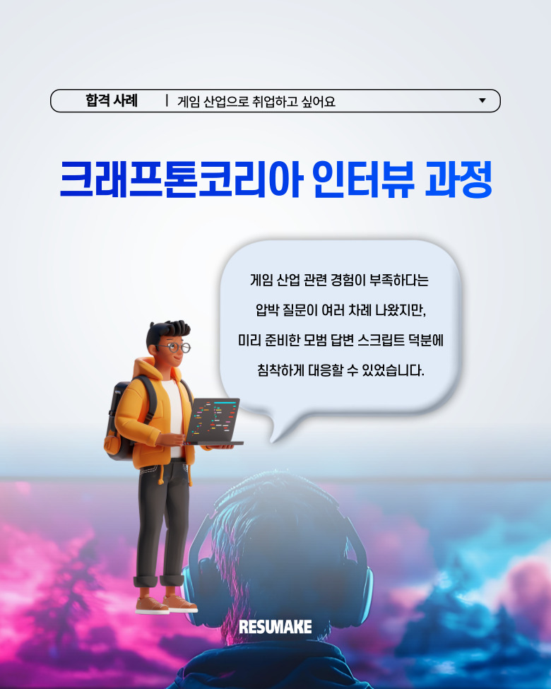 특히, 지원자가 게임 산업 관련 경험이 부족하다는 점을 근거로 압박 질문이 여러 차례 나왔지만, 레쥬메이크에서 준비한 모범 답변 스크립트 덕분에 침착하게 대응할 수 있었습니다.