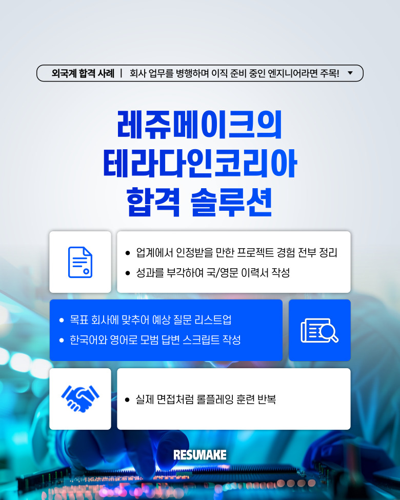 게다가 출장과 외근이 많은 업무 특성상, 혼자서 이직 준비에 집중하기 어려워 국/영문 이력서와 면접 준비를 레쥬메이크에 의뢰하게 되었습니다.