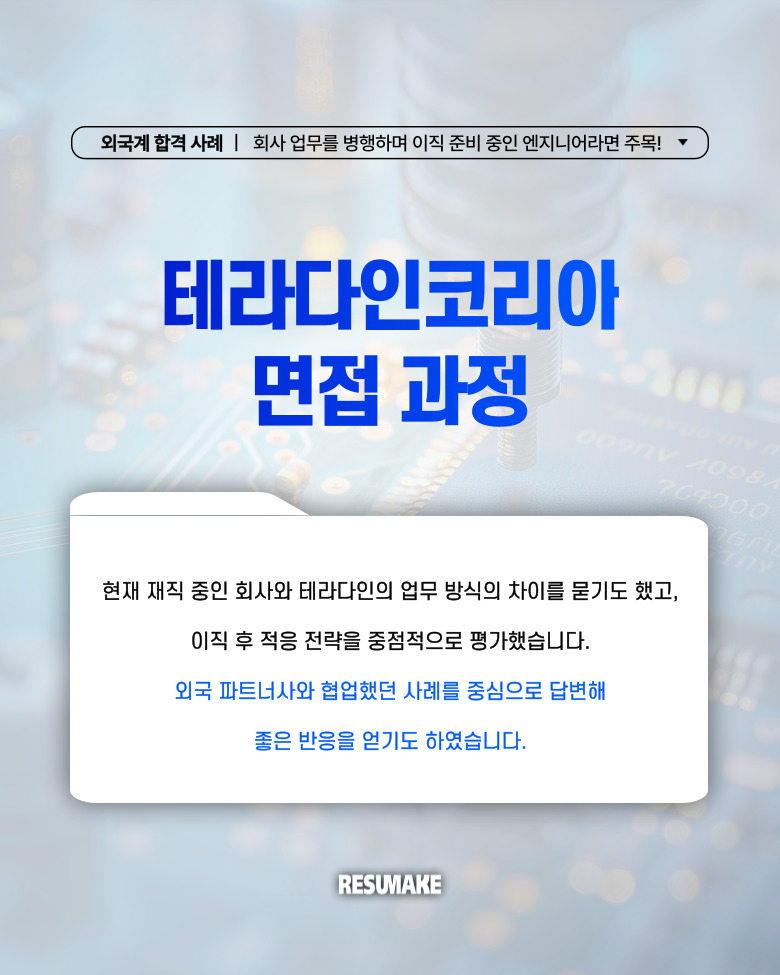 또한 현재 재직 중인 회사와 테라다인의 업무 방식의 차이를 질문받기도 했고, 이직 후 적응 전략을 중점적으로 평가받았습니다.