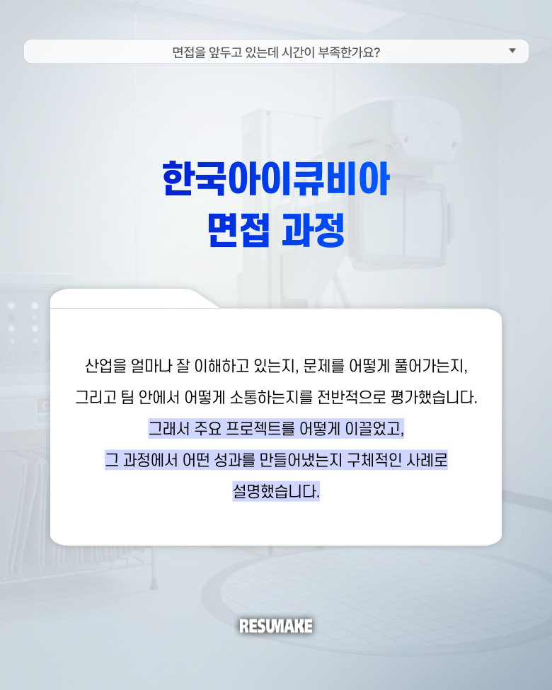 실제로 나왔던 질문들도 레쥬메이크에서 미리 예상하고 준비했던 것들이 대부분이었고 지원자는 연습해 왔던 답변 구조를 떠올리며 차분하게 설명을 이어갈 수 있었습니다.