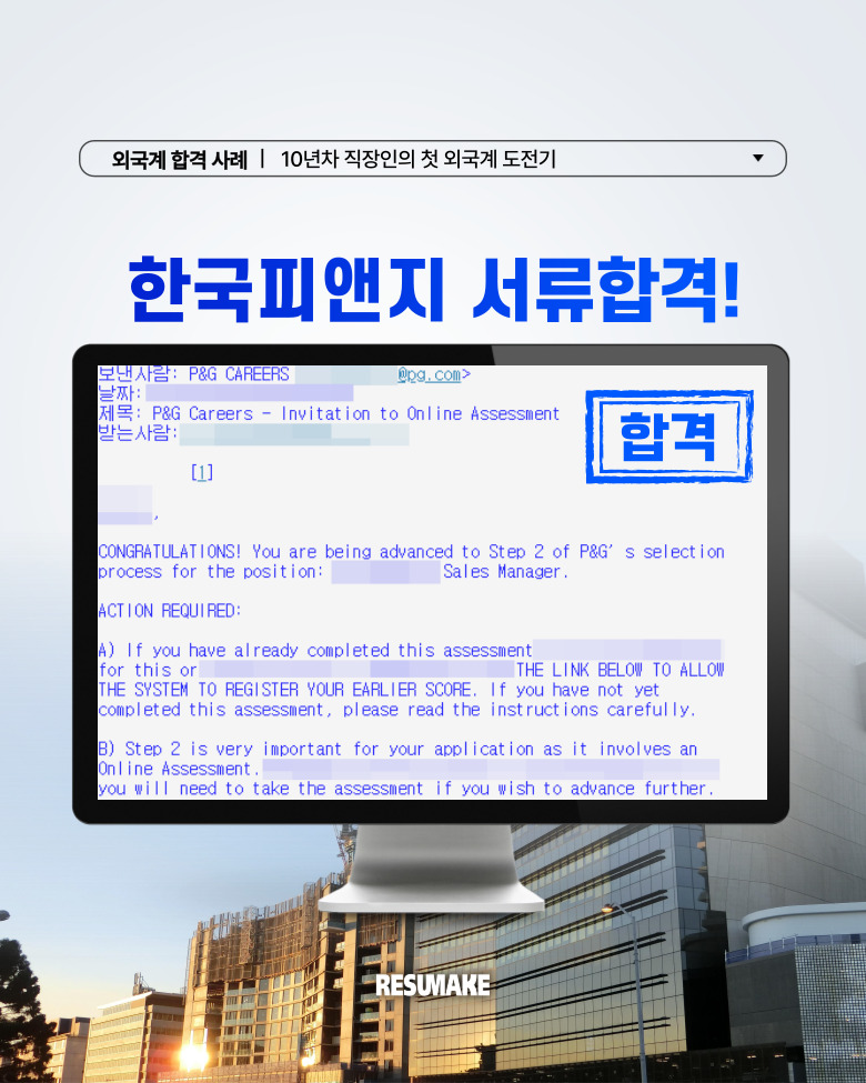 지원자가 한국피앤지에 이력서를 제출한 지 며칠 만에, 온라인 어세스먼트 과제 링크가 전달되었고 레쥬메이크 채용전문가는 이를 어떻게 작성하고 제출해야 하는지 레쥬메이크에서 상세히 안내했습니다.