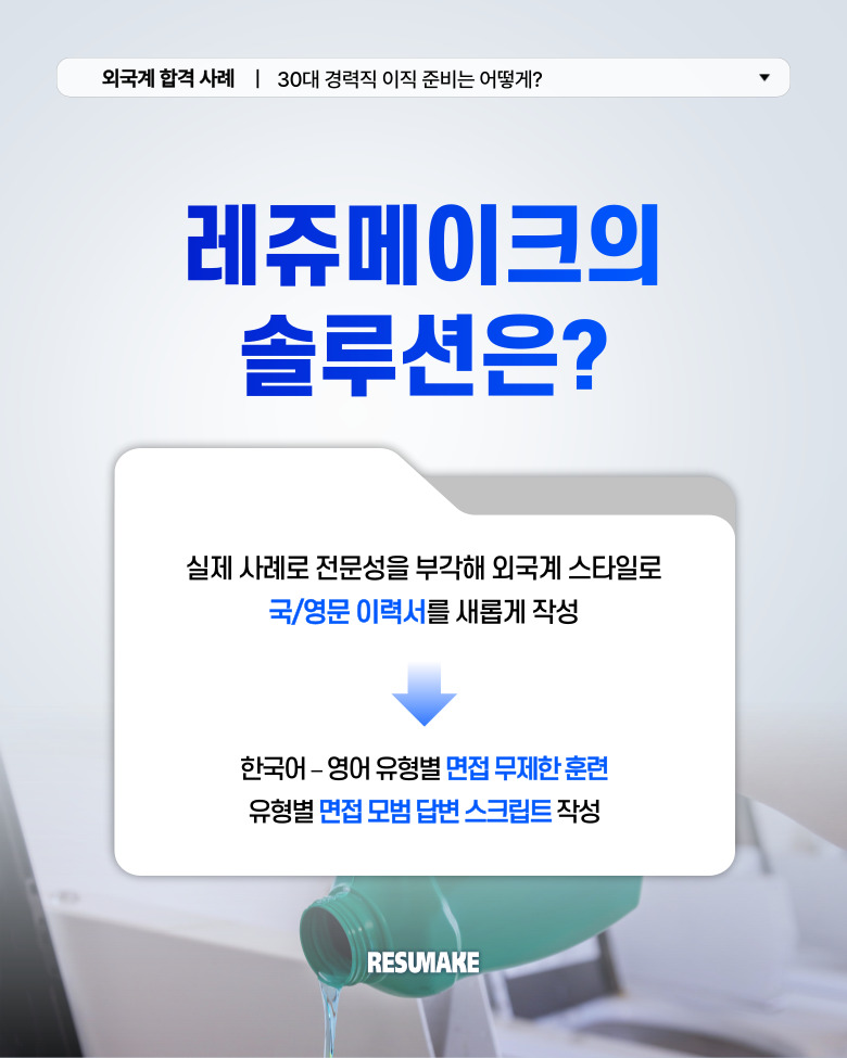 이를 계기로 국/영문 이력서를 전면 수정하고 면접까지 철저히 준비하고자 레쥬메이크에 컨설팅을 신청했습니다.