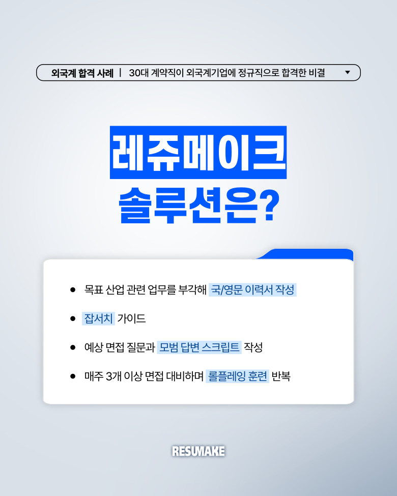 지원자는 유학 후 오랜만에 영어를 사용한 것이지만, 레쥬메이크의 원어민 컨설턴트가 제공한 스크립트를 바탕으로 언어 감각을 빠르게 되찾았기 때문에 무리없이 영어 질문을 소화했습니다.