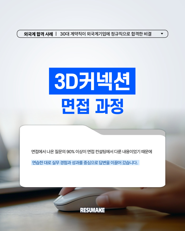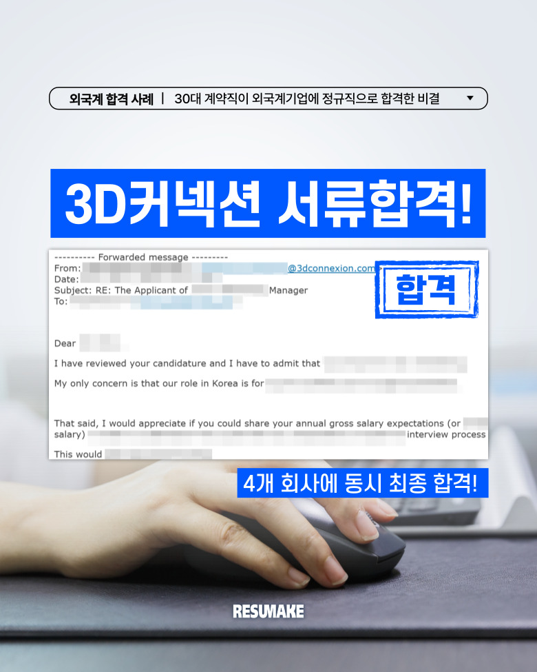 지원자는 결과적으로 3D커넥션 등 다양한 곳에서 인터뷰를 진행하고 4개 이상의 유명 기업에서 최종 합격 연락을 받았습니다. 그 과정이 궁금하다면 집중해서 내용을 살펴보기 바랍니다.