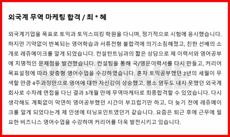 수많은 합격후기가 증명합니다(신입 / 경력 / 임원)레쥬메이크는 어떤 스펙이어도, 어떤 상황이어도 원하는 기업으로의 취업을 성공시킨 수천건의 합격 케이스가 있습니다. 지방대 출신 학점 2.0대로 외국계 기업 신입으로 최종 합격한 지원자, 2년 경력 단절 지원자 재취업 성공 사례, 연봉 최대 40% 인상하고 이직에 성공한 경력직 지원자, 국내 기업 출신 50대 후반 지원자가 외국계 임원급으로 성공한 후기까지.. 이제 당신이 그 후기의 주인공이 될 차례입니다. 합격사례 검색 총 915개 결과 ‹ 1 … 38 39 오로지 결과로만 말합니다(인턴 / 신입 / 경력 / 임원)레쥬메이크를 통해 원하는 기업으로 입사하세요. 후기가 가짜일 경우 전액 환불해 드립니다. 취준생이 전하는 레쥬메이크 컨설팅 후기대기업에 취업한 친구가 부럽기만 한가요? 언제까지 준비만 하고 있을 건가요? 다음 합격의 주인공이 될 기회를 놓치지 마세요. 꿈의 직장으로입사할 준비가 되셨나요?출근하러 가기